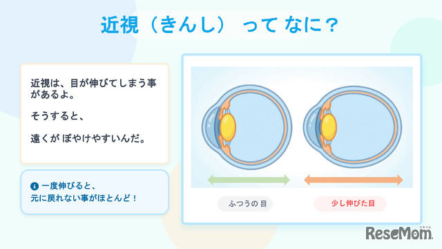山口先生在讲解眼睛构造时指出:"眼睛看近物时需要调动肌肉。因此长时间使用智能手机或阅读书籍等近距离用眼行为,会导致眼睛易疲劳。若持续专注近距离视物而缺乏远眺机会,眼睛将长期处于无法充分休息的状态。长期处于这种状态下,眼睛会试图适应'近距离视物'的环境,导致眼球纵深(眼轴)逐渐延长。眼轴延长后,焦点位置会偏离视网膜前方,从而形成远方物体模糊的近视状态。眼轴一旦延长便无法逆转,因此预防措施至关重要,"他特别强调。
